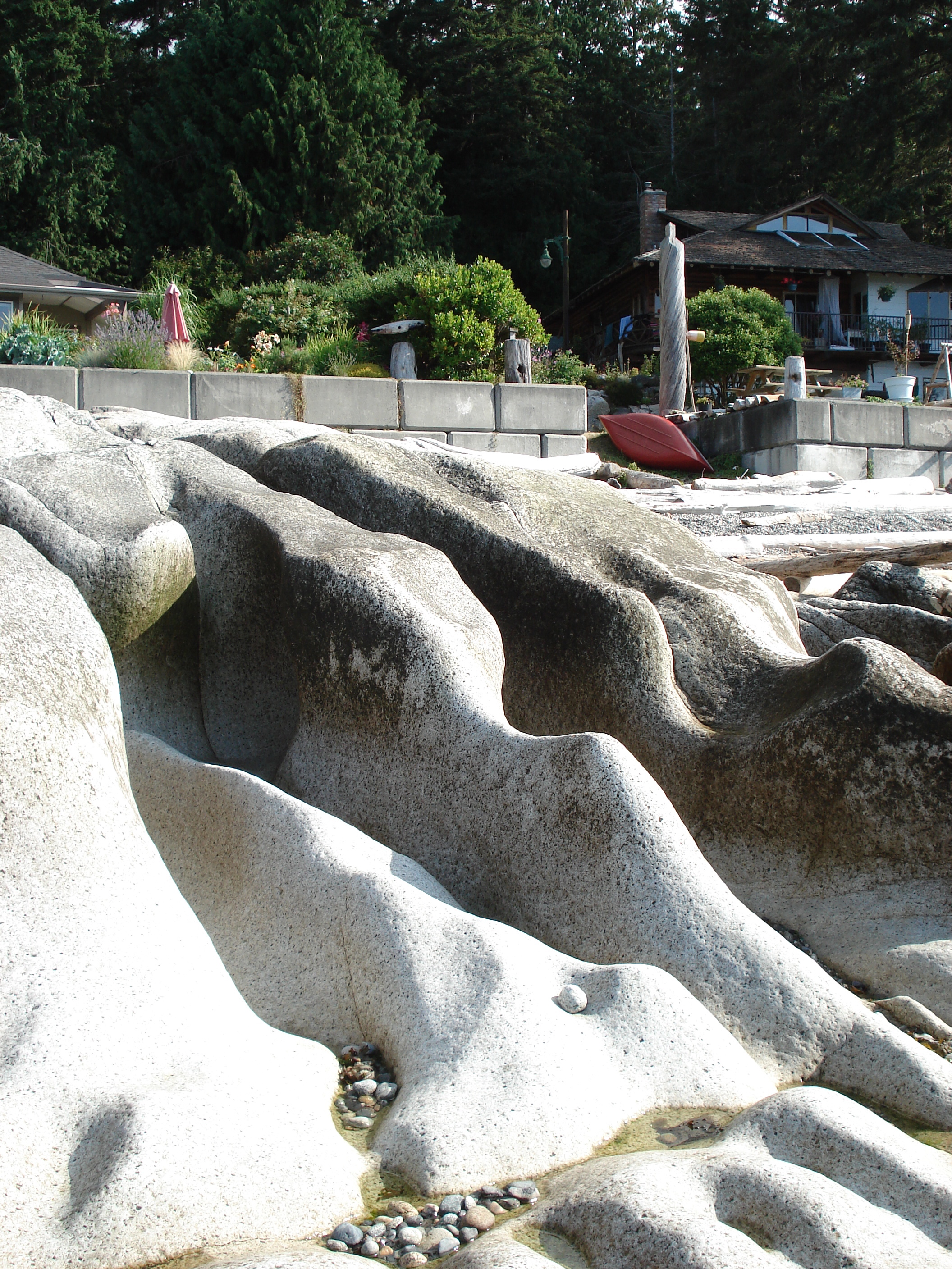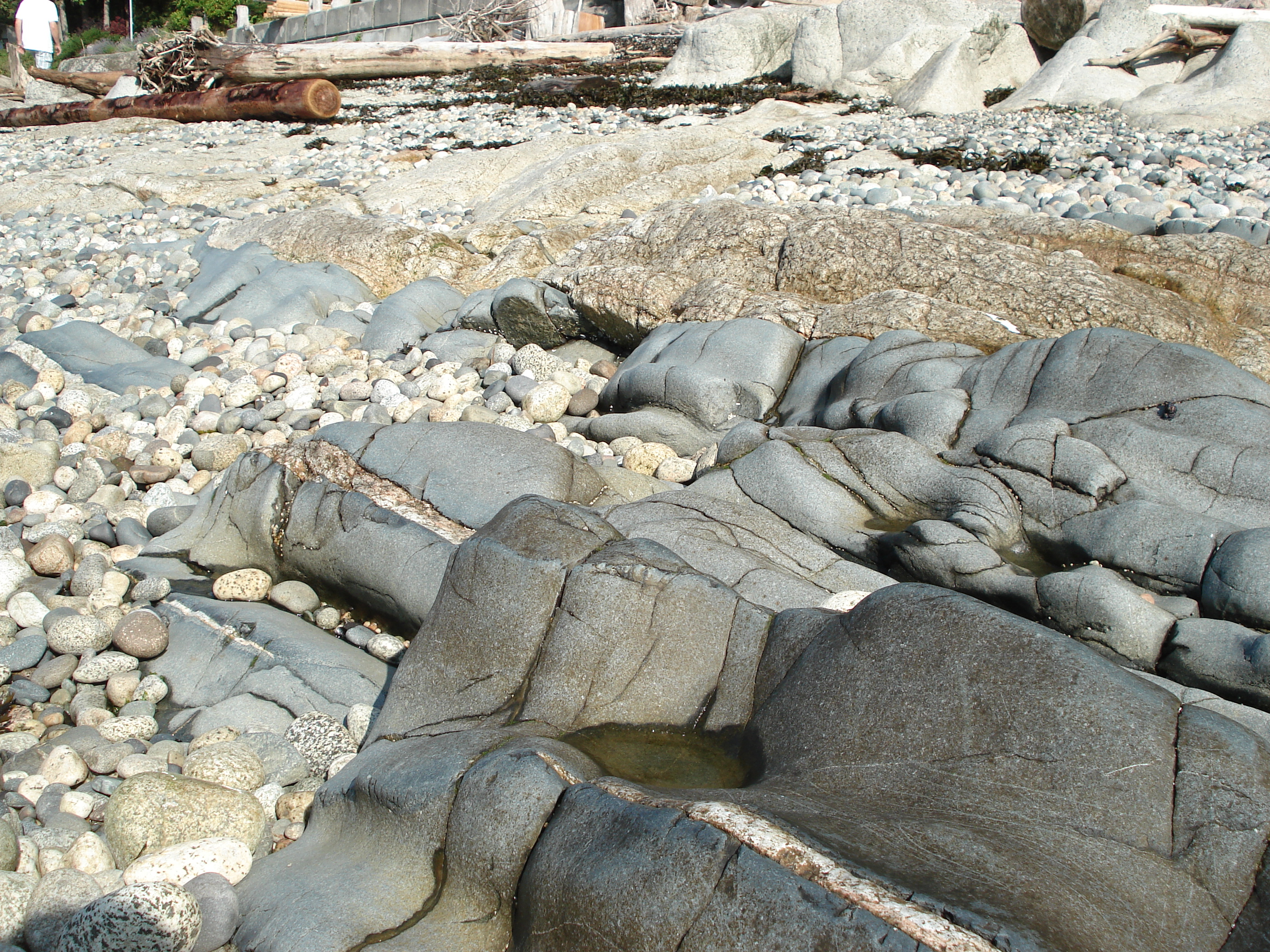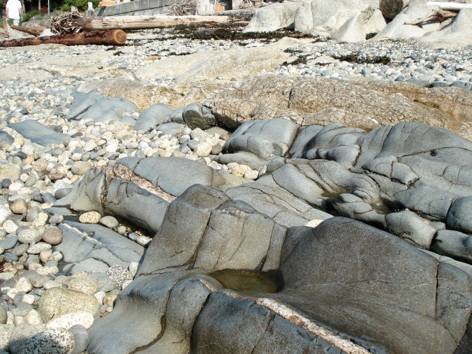 The coast we visited appears to be made up mostly of granite (the lighter rock above) with streaks of basalt (the grey rock). Or so our gracious host told me. The rest of the shoreline is covered in the smaller rounded rocks you see in the photos. When the waves crash against the shore, the pebbles scour out the bigger rocks and create the interesting smooth coastline I spent all morning clambering over.